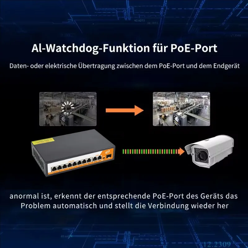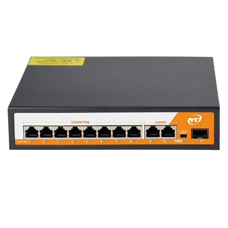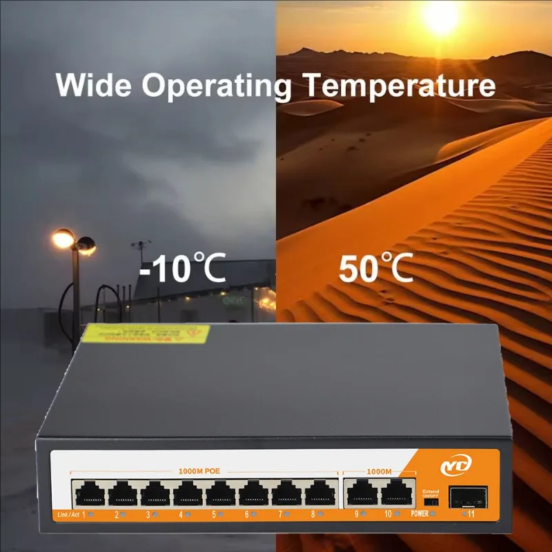 The 11Ports Network POE Switch is a robust solution for your network power supply needs. Designed to meet the demands of industrial environments, this switch is equipped with the latest high-speed Ethernet switching chip, ensuring ultra-high backplane bandwidth and rapid data processing capabilities. With a transmission rate of 1000Mbps for all (8) ports and (2) uplink ports, (1)SFP port this switch is capable of handling high-speed data transmission, making it ideal for a variety of applications.